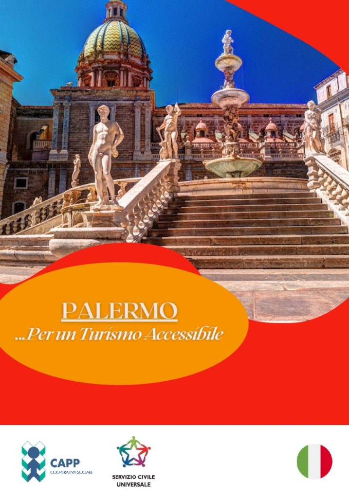 Questa brochure è frutto del lavoro degli operatori volontari del Servizio Civile Universale, realizzata con la supervisione del referente del Turismo Accessibile e OLP della CAPP Cooperativa Sociale, Valentina Franzone, in seguito alle attività progettuali che hanno previsto la mappatura di una selezione di siti turistici della città di Palermo. La brochure contiene inoltre utili indicazioni e riferimenti a siti web di associazioni, enti e istituzioni che si occupano di turismo accessibile.